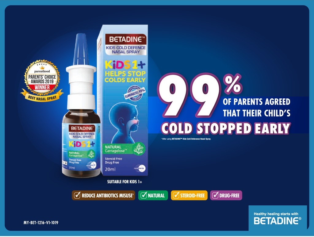 Betadine Cold Defence Kids Nasal Spray is an easy to use nasal spray clinically proven to fight against cold and flu viruses. Clinically proven to eliminate 99% of common cold and flu viruses and reduces chances of recurrence of cold and flu. Non drowsy and non-addictive product. Can be used during pregnancy or lactation under the advice of your doctor. It has a unique filter system that allows preservative free and in-use stability for up to 1 year after opening.
