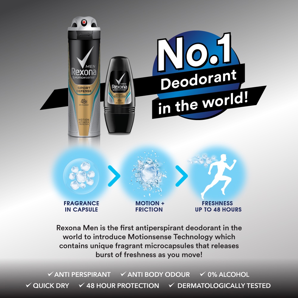 Rexona Men Sport Defense with MOTIONSENSE responds directly to movement, providing you with our longest lasting freshness ever. 48 hour protection against odour and wetness.