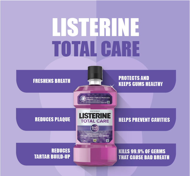 Listerine® Total Care mouthwash with fluoride is our most completed protection formula, clinically proven to clean and protect with 6 benefits for noticeably healthier mouth*