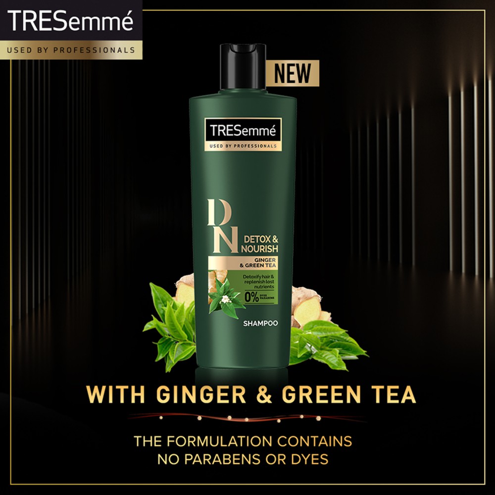 With natural ingredients Ginger & Green Tea, TRESemmé Detox & Nourish Shampoo deeply cleanses to detox hair from daily impurities build up and replenishes lost nutrients to nourish. The formulation contains no parabens or dyes. Designed for daily use, the detoxifying & nourishing formula gives you runway standard healthy, shiny hair everyday.